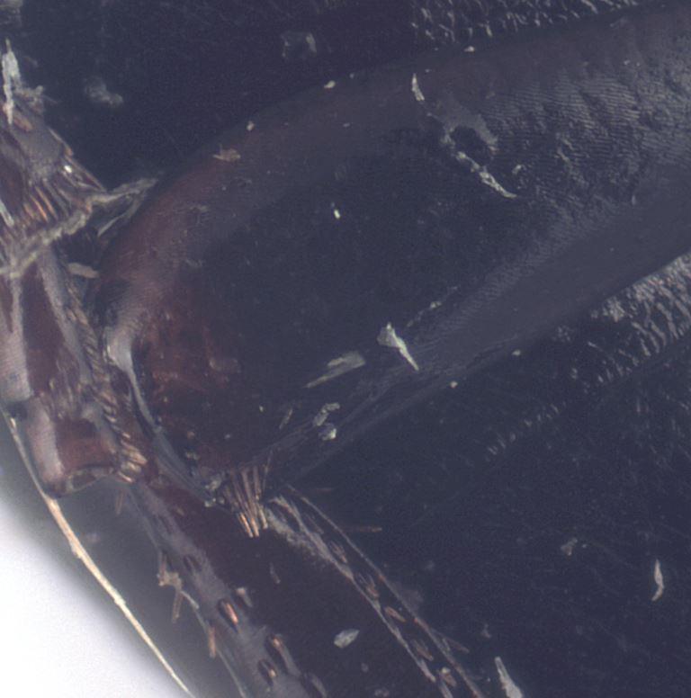 - Mi sembra .... che la serie anteriore di pori del pronoto sia interrotta solo per un breve tratto .... e che ci siano dei pori alla confluenza delle linee del reticolo (non su tutte le confluenze)