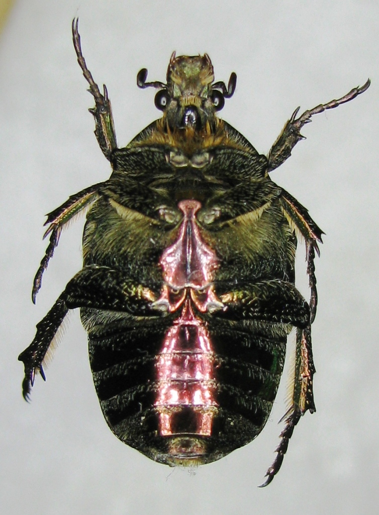 Pur concordando con l'osserazione dei particolari intimi della "bestia", noto che la foto della parte superiore appare priva di nitidezza nella parte centrale. Questo, probabilmente , è dovuto a poca profondità di campo della macchina adoperata e come conzeguenza genera una sfocatura che provoca l'impressione di una opacità della superficie che probabilmente è più lucida di quel che appare. La depressione sulle elitre esiste anche se attenuata dalla suddetta sfocatura. Certo non è una Cetonia. Attendiamo ansiosi. Alberto