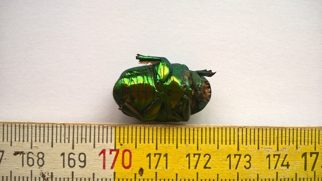 A prima vista, nella mia ignoranza, lo identificai come una Cetonia aurata (Linnaeus, 1758), ma, grazie anche al ritrovamento della settimana scorsa, mi sorse un dubbio sull'esattezza della mia precoce determinazione, in particolare per la differenza di dimensione delle due specie.