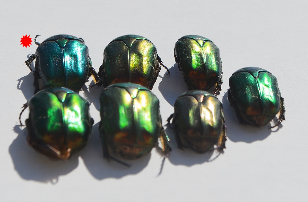 Ha un verde a contro luce che non saprei definire, turchese? acquamarina? nel confronto con le altre si capisce molto meglio, e in questa nuova foto si intuiscono un po' le due piccole macchie bianche. 'L'interessata' è quella marcata con la stella rossa.
