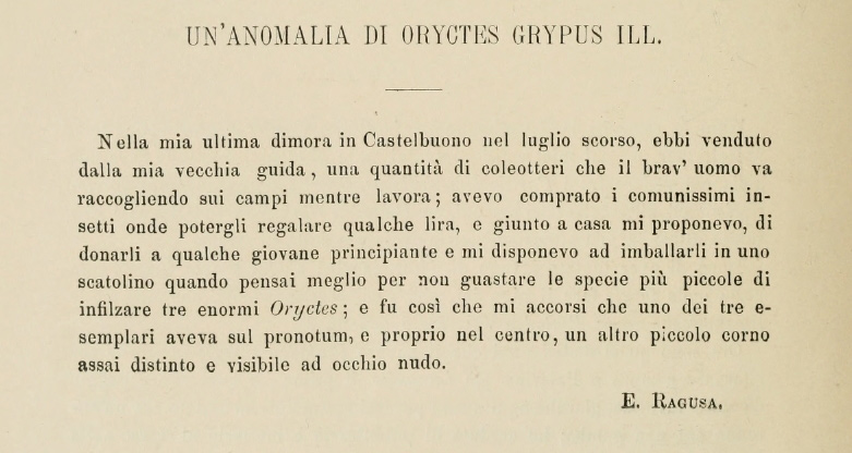 Ho avuto modo, di recente, di potere fotografare proprio l'esemplare "tipico" della collezione Ragusa descritto nel 1882 da G. Riggio come var. Ragusae. Ho piacere di mostrarlo qui agli amici del forum. Rispetto a quello di Alberto, come potete vedere, questo presenta il cornetto, ben sviluppato, nella parte mediana del protorace, come ben descritto da Ragusa prima e da Riggio poi, nei lavori sopra riportati. ![]() Nota - L'immagine fa parte di una serie di altre, raffiguranti sempre esemplari della collezione E. Ragusa, che saranno inserite in un lavoro dell'amico Marcello Arnone, di prossima pubblicazione su "Il Naturalista Siciliano", dedicato appunto agli Scarabeoidea presenti in collezione Enrico Ragusa. |