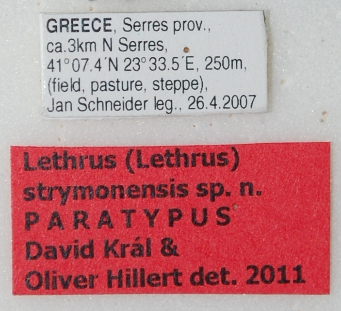 Sarebbe interessante conoscere l'anno dopo il det. nel cartellino di paratipo di Riccardo: è sempre 2011? E qui mi pongo due domande che desidero condividere con voi. In un cartellino di tipo (o paratipo) è corretto aggiungere "det."? Non sarebbe preferibile scrivere solo "Lethrus strymonensis Kràl & Hillert - Paratypus" ? E, in quanto all'anno, questo non dovrebbe corrispondere a quello "ufficiale" della descrizione, pubblicata, in questo caso, nel 2013? Scrivere ""Lethrus strymonensis Kràl & Hillert det., 2011" non è una sorta di paradosso temporale?