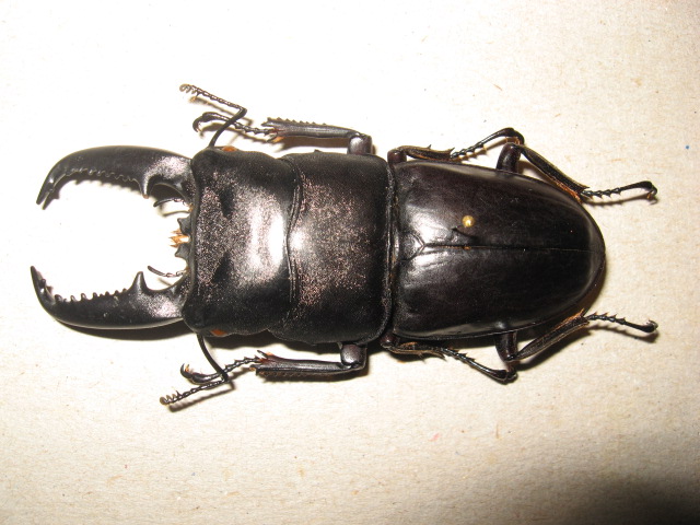 Questo meraviglioso Lucanidae mi è stato inviato da Lucio Morin, a cui ribadisco i miei più sinceri ringraziamenti. Sottospecie endemica dell'isola di Palawan (Filippine), di una specie ad ampia distribuzione indomalese; dall'India nordorientale al Giappone, passando per Nepal, Buthan, Indocina, Malesia, Indonesia (Borneo, Sumatra, Sulawesi), Filippine, Cina e Corea. E' uno dei lucanidi più grandi del mondo, la lunghezza massima dei maschi secondo la letteratura è di 108 mm. Come di regola fra i Lucanidi, la femmina è spesso lunga meno della metà. Dimensioni: 86 mm Visione ventrale: I ciuffetti dorati sulla parte inferiore dei tarsi sono una caratteristica di questa specie: |