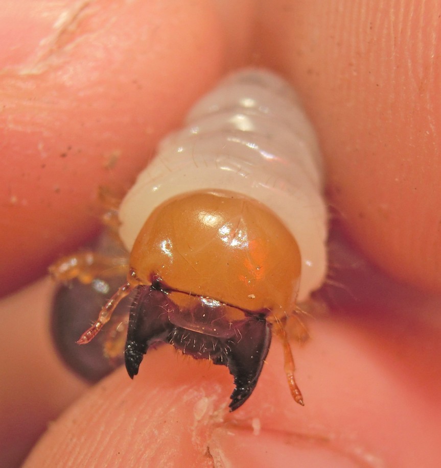 Per miglior raffronto ho utilizzato una larva matura di Dorcus presa nello stesso posto (e nello stesso giorno) in un ontano morto che fungeva da colonia di Dorcus (ci saranno state 100 larve costrette a vivere nelle loro feci perché il legno era pressoché finito!!!)