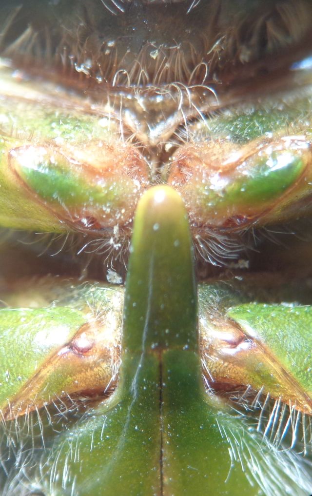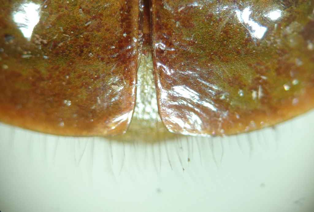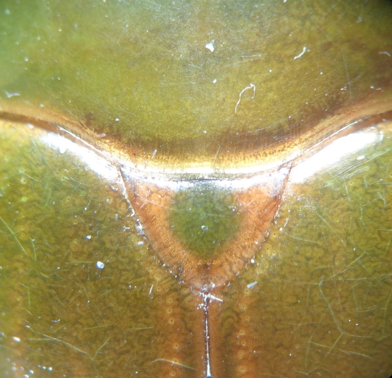 Inoltre presenta scutello verde solo al centro e parti inferiori verde oliva uniformi, con apofisi mesosternale molto lunga.