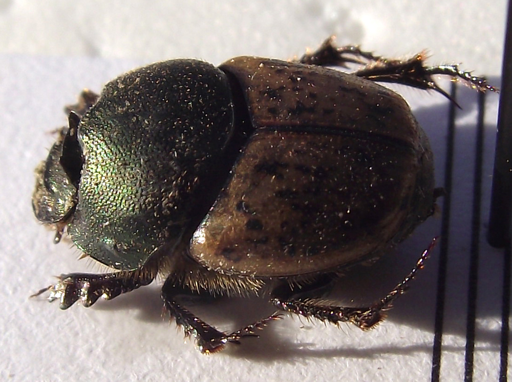 E se fosse il vecchio e rassicurante Onthophagus (Palaeonthophagus) vacca (Linnaeus, 1767)? Il pronoto è verde metallico e la carena del vertice del capo è elevata, con un cornetto ad ogni lato. I caratteri corrispondono con quelli dati dagli autori (Rossner et al., 2010) per differenziare le due specie.