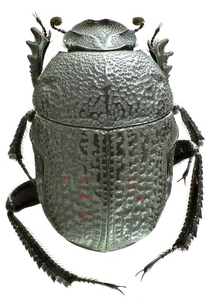 Devo dire che ho osato la determinazione perché mi pare di vedere, nel bordo inferiore di ogni area lucida in rilievo, dei puntini scuri (1-2) che, almeno dal confronto coi pochissimi esemplari di G. qurosh che ho in collezione, ho riconosciuto come i granuli piliferi diagnostici, che in G. flagellatus stanno invece nella parte opaca.