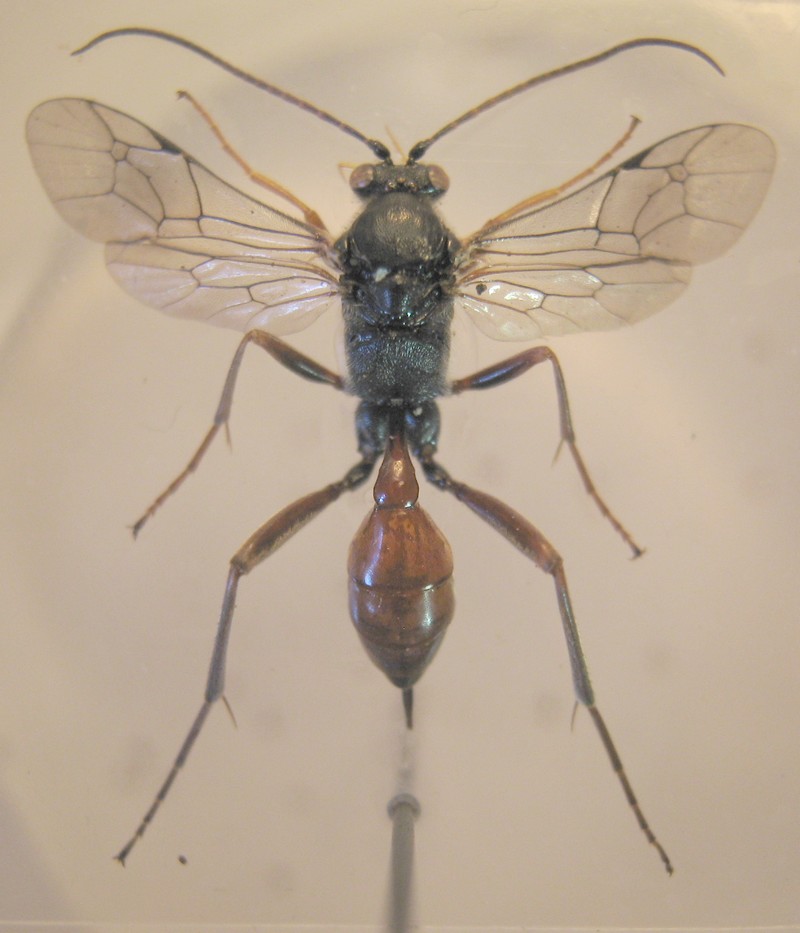 PS: sul fatto di spillare gli Ichneumonidi, è una questione di praticità. Se lo incolli come un coleottero, poi la forma delle mandibibole, i palpi o la carena posteriore del mesopluro come li vedi ? Al massimo, per evitare lo spillo, e non rovinare la punteggiatura del mesoscuto o i notauli, si può incollare su cartellino triangolare... (cosa che, almeno a me personalmente, richiede però più tempo)