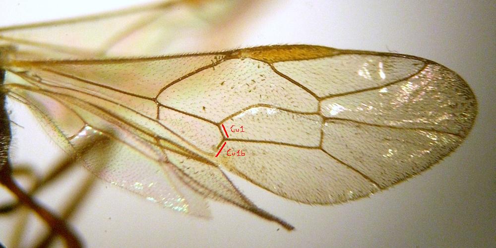 La discriminazione tra Agrypon e Habronyx per me è complicata, soprattutto visto che non ho materiale di confronto (come al solito vedrò se c'è qualcosa al museo appena ho un attimo prossima settimana). In realtà in Agrypon può mancare la carena sulle coxe anteriori e può anche mancare la carenatura trasversale del mesopleuron come in Habronyx. C'è però un ulteriore carattere discriminante, qui visibile nella venatura alare, che è il rapporto tra Cu1 e Cu1b; 0.75 o più in Habronyx, 0.60 o meno in Agrypon. Il problema è che Habronyx dovrebbe avere una parvenza di vena Cu1 (discoidella) nell'ala posteriore mentre qui non c'è nulla ! Mah... sono francamente perplesso... Qui tocca rigirarsi la bestiola tra le dita, sotto la lente dello stereoscopio...