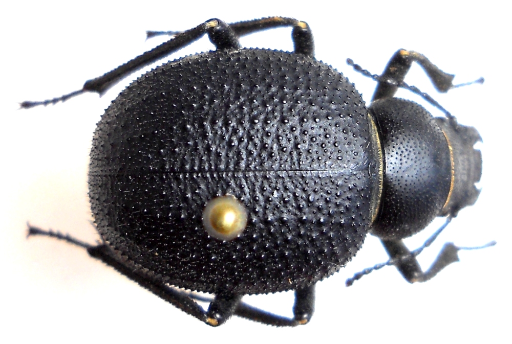 Notare la scultura delle elitre, prive di carene e con tubercoli lucidi di diverse dimensioni