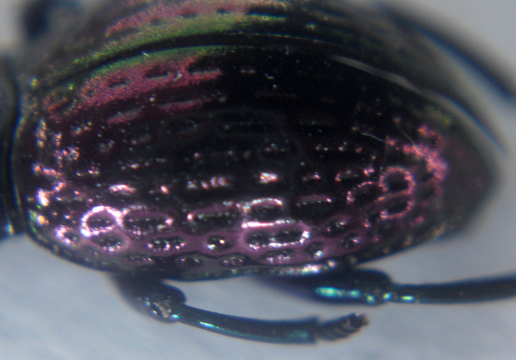 Questo piccolo Tenebrionide mi ha incuriosito per la bellissima colorazione, verde-blu su testa e torace e viola sulle elitre.
