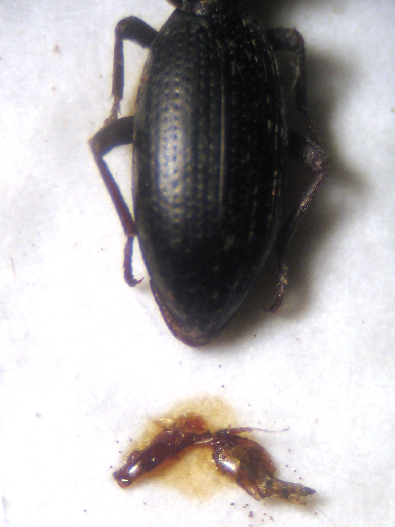 Per pulire facilmente gli edeagi (anche estratti da esemplari riammorbiditi) da membrane e schifezze varie, ti consiglio di immergerli in una gocciolina di ammoniaca e di agire al microscopio con due spillini sottili; l'ammoniaca ammorbidisce istantaneamente le membrane che di solito avvolgono l'edeago, rendendo facile l'operazione.