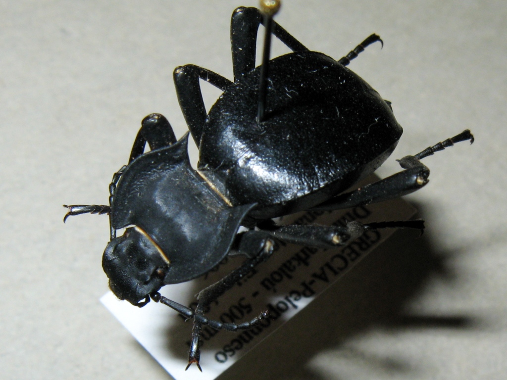 Akis elongata Brullé 1832 Ne sono piuttosto sicuro ma l'ho fotografato ed eccolo qui. In Grecia dovrebbe essere l'unica specie di Akis L. = 22 mm ps: ho un altro esemplare più costiero, poco più piccolo e con le elitre più bombate ma non vedo cosa altro potrebbe essere, magari è un maschio e questa la femmina. giusto per confronto eccolo qua. Trovato morto a Nauplia (Nafplio), 20 mm |