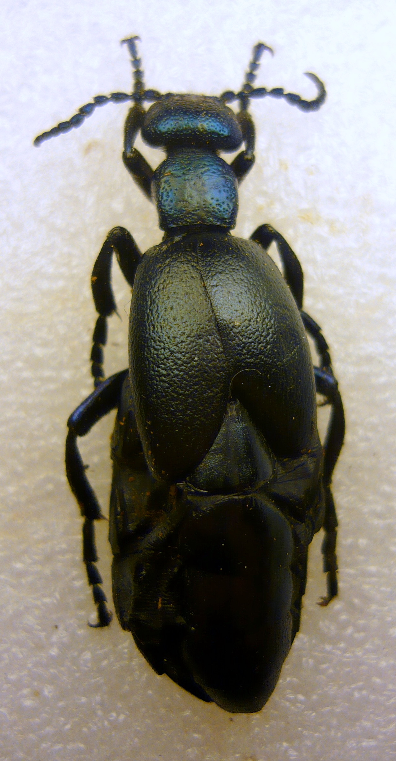 Giusto per far vedere il risultato del metodo del freezer, ecco due brutte foto fatte ora di corsa con scatto singolo e con la macchina in mano (senza neanche pulire l'esemplare dalla polvere) del Meloe di cui parlavo tempo fa in questa discussione, una volta secco. Mi pare che sia sufficientemente simile alla forma che hanno da vivi, e senza togliere alcun organo interno.