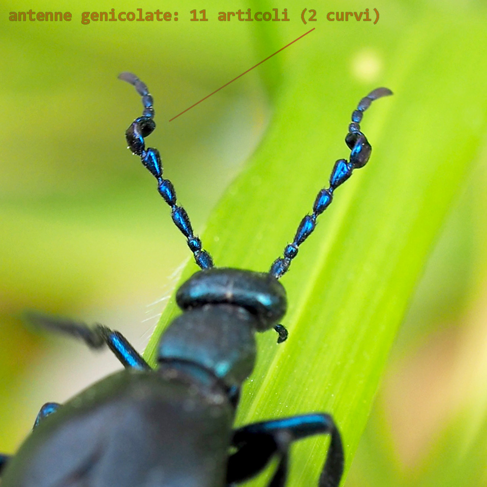 Sì, maschio di Meloe (Meloe) proscarabaeus Linnaeus, 1758. Le parti laterali opache sono membranose e non sclerificate come il dorso dei tergiti e portano gli stigmi respiratori. Sono le larvette neonate a portarsi sugli steli fioriferi ed interessate ai vettori apidi per aggrapparsi a loro ed essere trasportate nei loro nidi. Gli adulti non hanno tale interesse.