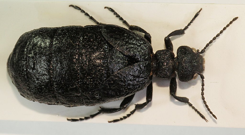 Giusto per far vedere il risultato del metodo del freezer, ecco due brutte foto fatte ora di corsa con scatto singolo e con la macchina in mano (senza neanche pulire l'esemplare dalla polvere) del Meloe di cui parlavo tempo fa in questa discussione, una volta secco. Mi pare che sia sufficientemente simile alla forma che hanno da vivi, e senza togliere alcun organo interno.