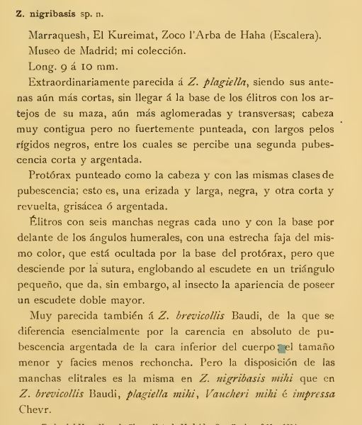 Allego la descrizione di Escalera secondo cui la Zonabris nigribasis si distingue da Zonabris brevicollis per l'assoluta assenza di pubescenza argentata nella parte inferiore del corpo. |