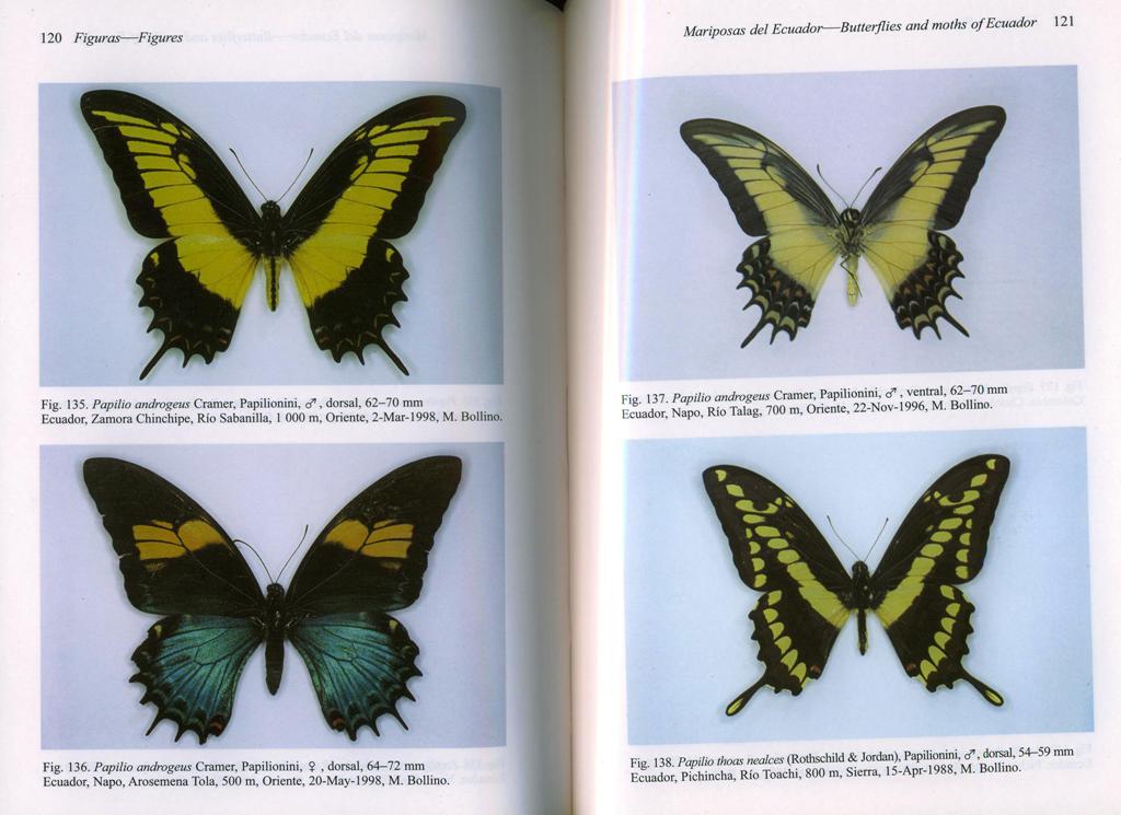 Quito 2001, cm 15x21, br., pp.175, 228 ill. fotogr. a col. bilingue: spagnolo, inglese. Nell’opera sono rappresentate ben 61 specie ecuatoriane ed 8 la cui presenza è da confermare. Si colma con questo volume un vuoto che esisteva per questa famiglia, così ben rappresentata in Ecuador, dando un ulteriore e validissimo contributo alla conoscenza della Fauna entomologica di questo paese.
