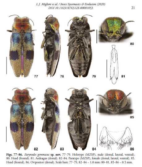Vi ricordate il Buprestidae trovate sulla Bromeliaceae Aechmea blanchetiana? Adesso ha un nome: Eurynodes gemmatus Migliore et. al, 2020. La nuova specie, con altre 4 specie nuove per la fauna Braziliana, fà parte di un lavoro molto più grosso, la revisone della sottotribù dei Cylindromorphoidina Cobos, 1979,(Aphanisticini Neotropicali) fatto insieme a Gabriel Biffi e Gianfranco Curletti: A revision of Cylindromorphoidina: comparative morphology, genera reassessment and description of new species (Coleoptera, Buprestidae, Agrilinae).