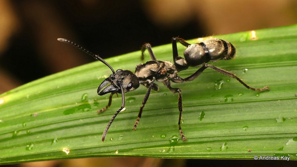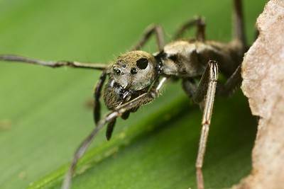Il mirmecomorfismo come mimetismo batesiano è EVIDENTISSIMO ed INEQUIVOCABILE in alcuni casi, quindi non ci sono dubbi. Guarda per esempio Sphecotypus niger, un ragno neotropicale, che indiscutibilmente mima alcune Neoponera spp. (per esempio la comunissima Neoponera villosa) e lo fa sicuramente per mimetismo batesiano perché le Neoponera hanno una puntura atroce. Notare soprattutto lo pseudo-ocello monolaterale sul cefalotorace che mima un occhio della formica e il restringimento dell'opistosoma identico a quello del gastro delle Ponerinae. Davvero non facile cogliere subito la differenza. Semplicemente sì: i predatori a cui è rivolto il mimetismo batesiano mirmecomorfo (ma in generale tutte le forme di mimetismo batesiano tra gli artropodi, e non credo che vogliamo metterlo in discussione in tutto il Phylum) non sono principalmente (cioè nella maggior parte dei casi) altri artropodi, ma vertebrati (uccelli, rettili, piccoli mammiferi). Ma questo cosa cambierebbe? Cita: Ho raccolto su FNM una galleria fotografica di ospiti, simbionti, spazzini o parassiti, fotografati dentro formicai, e nessuno di loro somiglia visivamente ad una formica. Questo perché, come già detto, mirmecofilia e mirmecomorfismo non sono per niente correlati, ma indipendenti. E anzi, la concomitanza delle due cose è estremamente rara, dato che un animale mirmecofilo, vivendo per la maggior parte del tempo nei nidi delle formiche, di solito non ha una grossa necessità di mimetismo, mentre è proprio tra gli animali non mirmecofili che esiste eventualmente un vantaggio maggiore nel mimare qualcos'altro. E anche qui non vedo il punto...