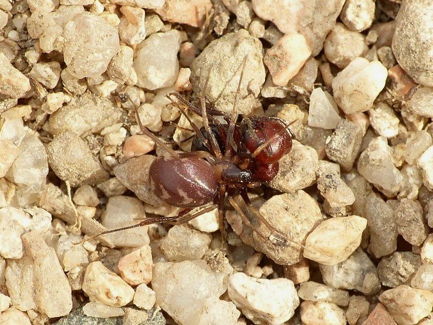 Allego due foto di ragni predatori di formiche. Euryopis forse ha una cerca somiglianza con un addome di formica nera, ma Zodarion somiglia poco. E comunque, visto che questi ragni frequentano le formiche, presumubilmente il mimetismo è utile per essere confusi con le formiche da parte dei predatori di ragni, e non per essere accettati dalle formiche stesse, che si regolano sostanzialmente con gli odori.