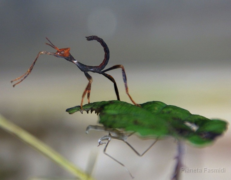 Mi hai preceduto Vincenzo ci pensavo proprio prima che hai inserito il tuo post, a Extatosoma tiaratum che hai già ben spiegato, si in effetti è il mirmecomorfismo che si avvicina di più proprio a quello che stiamo discutendo in questo post, inoltre in questa specie E.tiaratum è qualcosa di eccezionale perché ciò avviene solo nella neanide perché dopo la prima muta l'aspetto dei colori cambia e no ha più la testa rossa e il corpo nero, anche il comportamento cambia dopo la prima muta, infatti appena nati corrono velocemente proprio come farebbe una Leptomyrmex questo devo dire è qualcosa di stupefacente da parte di questa specie che cammuffa sia le uova che sembrano semi le fa raccogliere dalle formiche e tenere al caldo umido quando nascono assomigliano e si comportano come loro e poi comunque dopo la prima muta in poi, si comportano con movimenti più lenti, ondeggiano come foglie e da adulti ricordano uno scorpione...... direi "ecceziunale veramente"