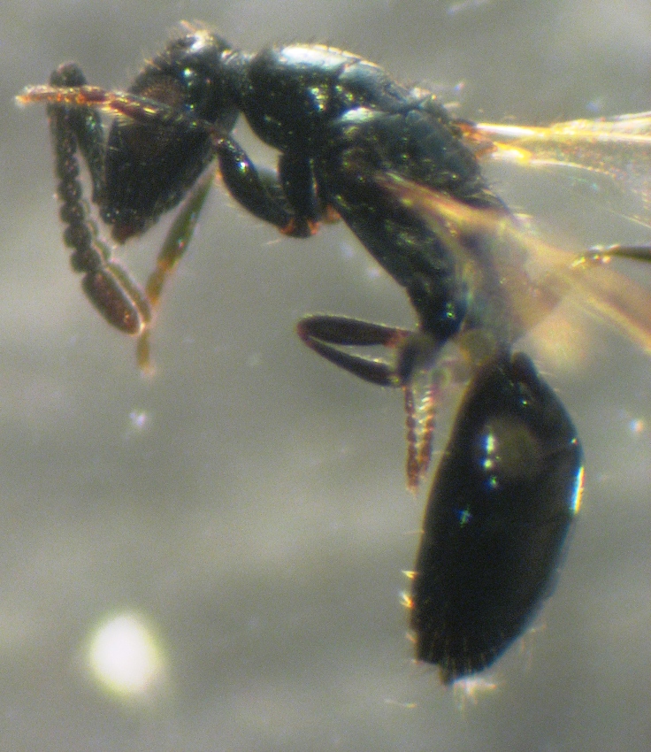 Pardon per il necropost! Giravo e ho visto la discussione. Volevo esprimere il mio parere su questa bestiolina... Certamente non Formicidae per alcuni lampanti motivi: - anatomia del torace completamente diversa dalle forme alate (ed eventualmente anche dalle forme intermedie ergatoidi) di Formicidae: qui c'è un ampio pronoto e scuto molto piccolo in relazione a pronoto e scutello. Nelle forme alate delle formiche prende il sopravvento lo sviluppo dello scuto che "ricopre" quasi completamente il pronoto e che è nettamente più esteso dello scutello. - è vero che le antenne sono ben genicolate con lo scapo lungo, ma nelle formiche l'inserzione delle antenne si trova sopra il margine posteriore del clipeo che è sempre ben esteso. In questa bestia l'inserzione è praticamente adiacente le mandibole con evidentemente un clipeo ridottissimo. - forse più importante di tutto: non c'è un peziolo ben formato con almeno un corpo nodoso. Niente peziolo con corpo nodoso = niente formica! Secondo me siamo fuori dalla superfamiglia Vespoidea. Personalmente penso, senza certezza, che potremmo essere in Chalcidoidea.