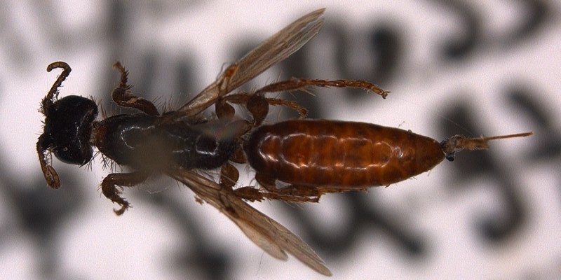 Secondo me, dobbiamo riprendere tutto dall'inizio Siamo partiti a mio avviso da un presupposto sbagliato, che ci ha portato fuori strada. Il nostro punto di partenza è stato infatti quello che l'imenottero mostrato da Roberto fosse un Tiphiidae (Hymenoptera, Vespoidea). Ma ne siamo poi certi? I Tiphiidae, strettamente imparentati con gli Scoliidae hanno una caratteristica importante in comune con quelli. Il primo ed il secondo sternite addominale sono fra loro separati da una profonda depressione (vedi qui) che nell'esemplare di Roberto non c'è. Primo e secondo sternite sono uno di seguito all'altro, senza traccia di restringimento alcuno. Questo carattere, unito a quello della nervulazione delle ali anteriori assai ridotta, mi fanno convincere che si tratti invece di un Bethylidae (Hymenoptera, Chrysidoidea). Anche questi imenotteri sono predatori di larve di coleotteri. Ho trovato un'immagine che sembra proprio fare al caso nostro Mi riferisco a questa