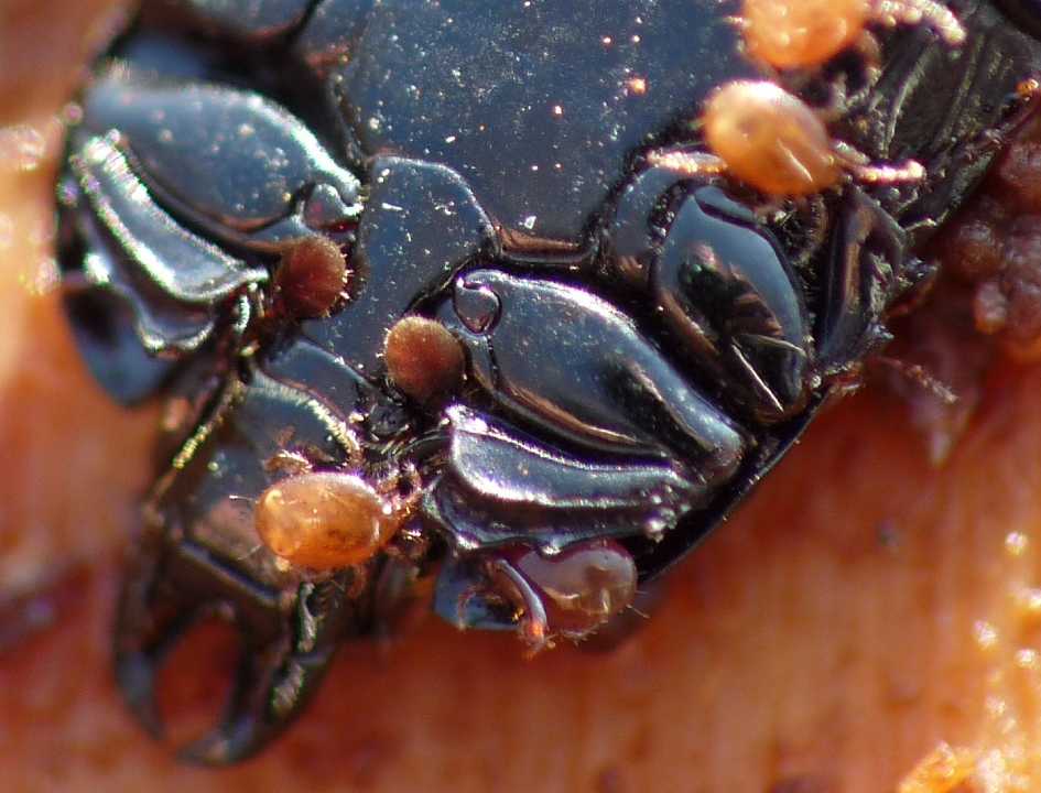 Caro Livio, gironzolando per le varie sezioni del forum ho scoperto solo ora di questa discussione. Confermo anch'io che si tratta di acari....fetenti!  perché non di rado ne trovo attaccati alle zampe e all'addome (ma non solo) delle mie bestiole e sono piuttosto "rognosi" da staccare. Infatti se li tiri via con le pinzette, quasi sicuramente ti resta quel "peduncoletto" ancora attaccato!  A volte riesco ad eliminarlo col microbisturi ma non è sempre così semplice! Per quanto riguarda l' Histeridae, se riesci a fare qualche foto nitida sopra/sotto, cerco di dirti di cosa si tratta! A presto!
