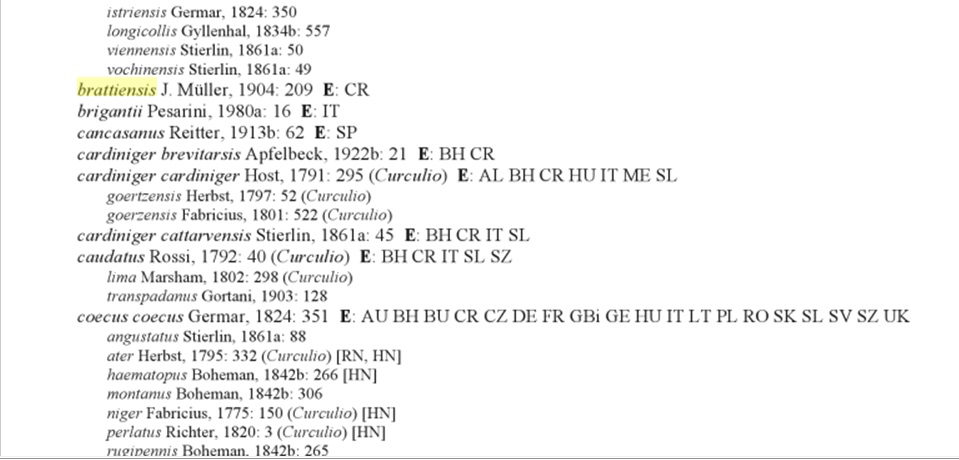 Comunque, procedendo un "passetto" alla volta, iniziamo con il dire che nell'ultimo Catalogo, la specie Otiorhynchus brattiensis J. Muller, 1904, viene data come presente esclusivamente in Croazia.....ma questo vuol dire poco....e forse già lo sapevate! :oops: :?