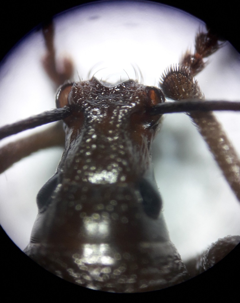 There are 2 conflicting features in the specimens here, in relation to J. Pelletier's key: Clearly prominent eyes and relatively longitudinal antennal segments 3-6.