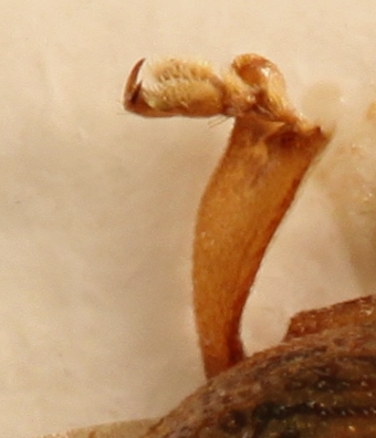Aggiungo che, osservando al binoculare la forma dello sperone, mi pare che si rafforzi l'ipotesi dell'aggancio con l'uncino della femmina: esiste una scanalatura (non rilevabile dalle foto) che percorre longitudinalmente la tibia e sembra costruita per alloggiare l'uncino. Una cosa così: