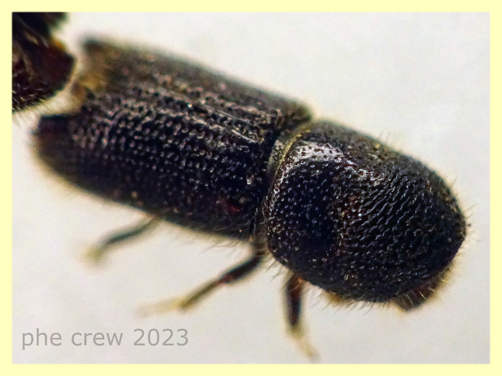 ....credo sia Orthotomicus erosus, sotto corteccia di Pino ho prelevato una decina di esemplari dai 2,4 ai 3 mm. La disposizione delle punte alla fine delle elitre si notano meglio nella foto in orizzontale (quella con i tratti rossi), appena si sposta un po l' angolazione della foto non sembra quasi piu' lui, cosi' come la strozzatura a meta' pronoto dove si nota meglio nella foto 4 |