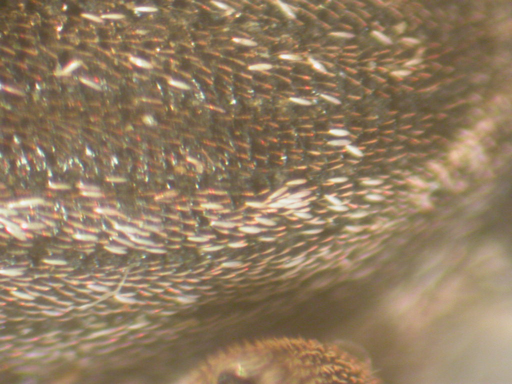 Vediamo un po' se si riesce ad andare avanti su questa bestia. Macchia omerale laterale assente: Squame sottili e allungate, di aspetto madreperlaceo: Non so se dalla foto si veda ma il segmento anale è privo di solco: