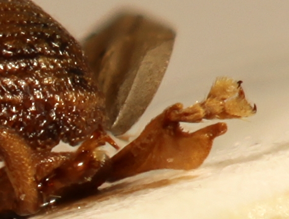 La singolare conformazione delle tibie posteriori, che avevo pensato caratteristica dell'ipotetica sp. 4, è invece comune a tutti i maschi di insolitus. Il passo successivo è ipotizzare che allora la torsione dei tarsi, presente solo nell'esemplare raffigurato in questa discussione, sia casuale. Sono convinto che le due articolazioni siano state forzate durante la cattura o in seguito alla preparazione (meno probabile, perché l'ho preparato io e me ne sarei accorto). La posizione normale dei tarsi è dunque quella qui sopra raffigurata. Essendo tutti gli altri caratteri corrispondenti, la prima conclusione è che non esiste una sp. 4 e che l'esemplare oggetto di questo post è: Ulomascus (Dimorphotarsus) insolitus Hoffmann, 1965, maschio, Curculionidae Curculioninae Ulomascini (prego di rinominare, grazie). Secondo: se in questa specie tutte le femmine hanno le unghie posteriori ad uncino e tutti i maschi hanno le tibie posteriori con il processo qui raffigurato, allora l'interrogativo che ci ponevamo sulla funzione di queste singolari strutture va tranquillamente verso la sua soluzione. Durante l'accoppiamento l'uncino si aggancia alla sporgenza e questo facilita il lavoro alla coppia. Stessa funzione, quindi, dei tarsi adesivi del maschio che fanno presa sul corpo della femmina o della concavità della parte ventrale dello stesso. Non conosco però altri esempi di analoghe strutture (uncino/sporgenza) nelle zampe di altri insetti. Cosa ne dite?