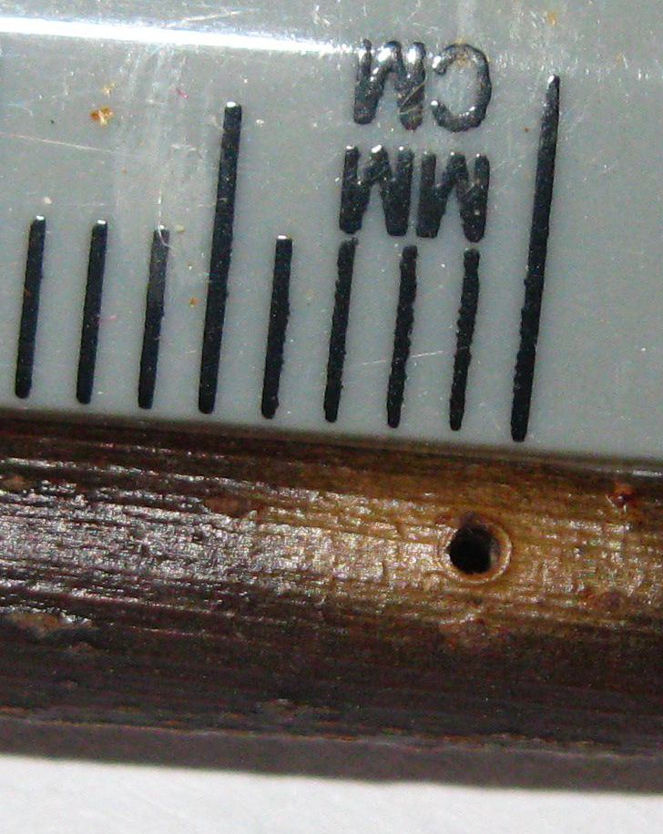 Oggi ho riguardato alcune piante colpite dall'insetto. Ho notato che alcuni fori erano occlusi da qualcosa di nero. Ho tagliato una porzione di ramo con una di queste gallerie occluse e l'ho sezionata a casa. All'interno c'erano 6-7 insetti di circa 1,5 mm di lunghezza (Scolytidae credo). Beh, credo proprio siano ospiti che hanno approfittato abusivamente delle gallerie prescavate, ma mi sono sentito di segnalarvelo comunque. Vi allego 2 foto purtroppo ben poco utili a determinare la specie perché fatte con la mia compattina che non mi dà macro buone di soggetti così piccoli. Spero di potermi attrezzare meglio a breve.