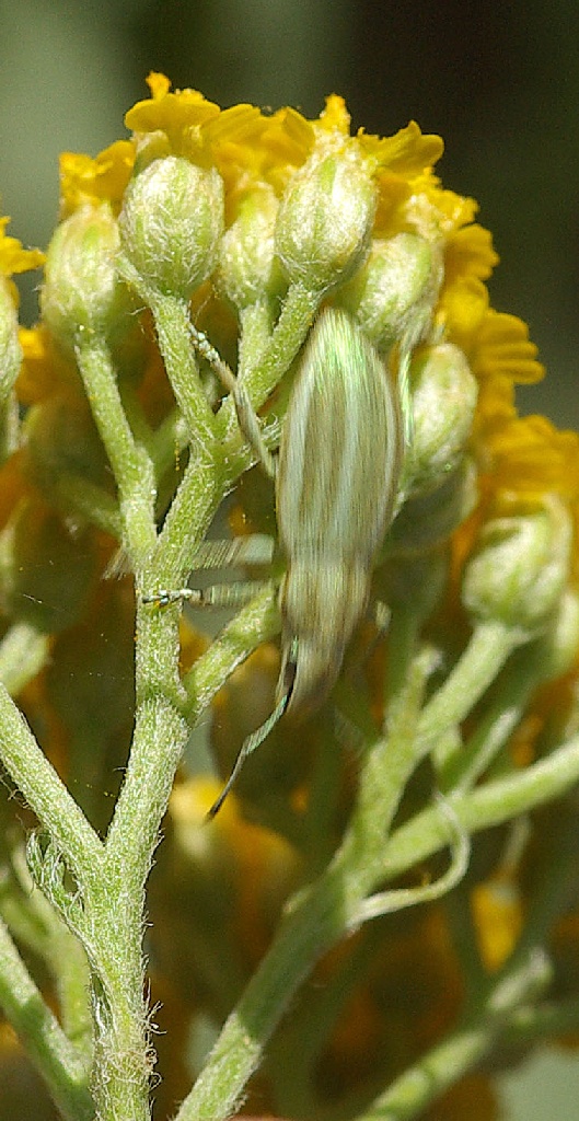 Da notare, che lo squisito colore pastello risulta assai mimetico tra i rametti tomentosi delle ombrelle di Achillea. Complice anche il pattern "gessato" non era per nulla faclie riuscire a vederli anche girandole e guardando sotto. Lo potete vedere in questa foto, dove un esemplare si è tradito dandosi alla fuga.