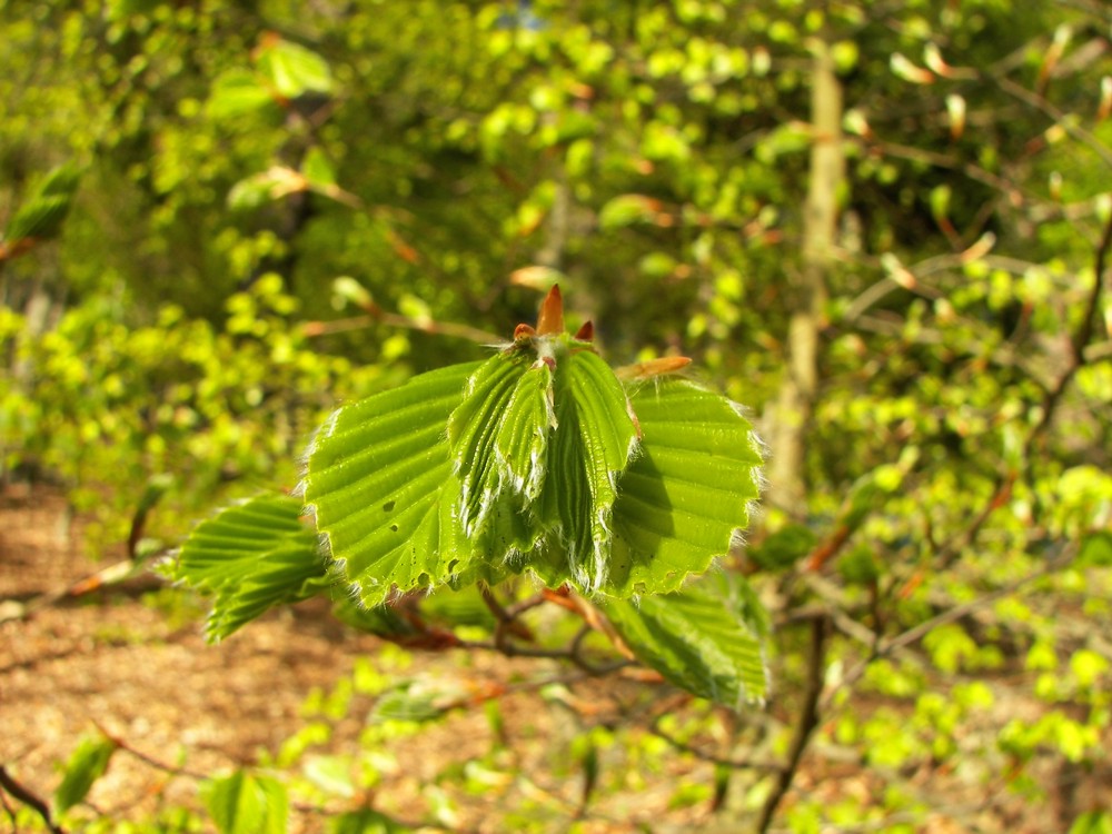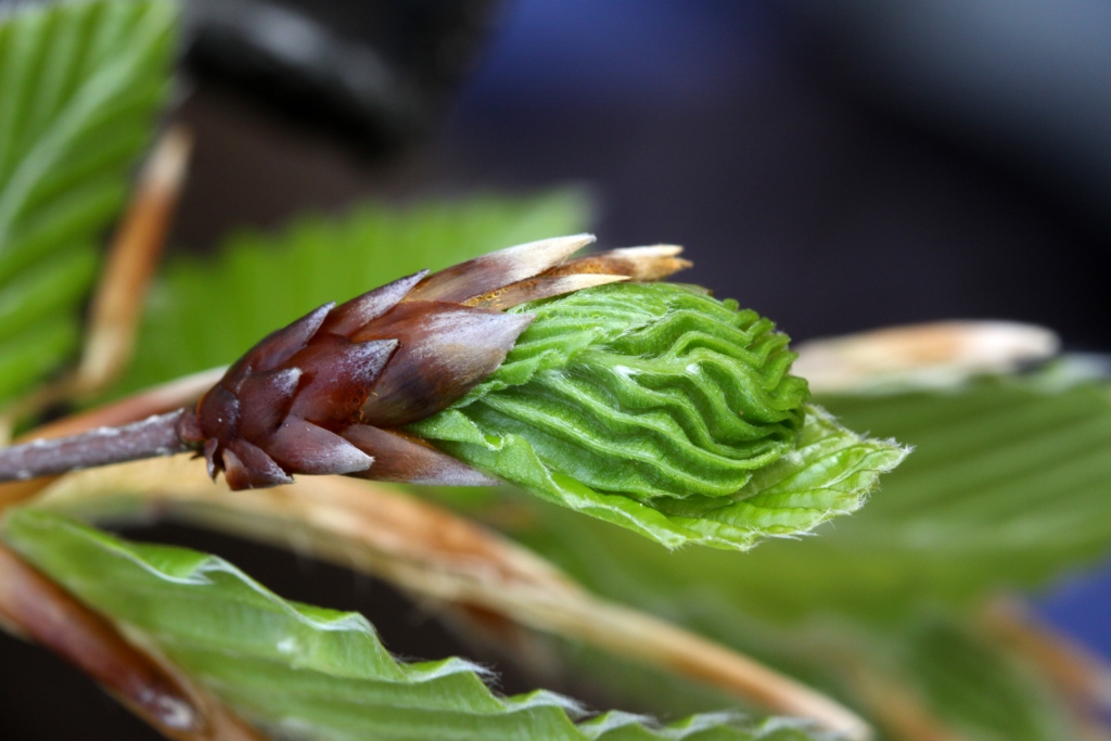 Ho un po' di novità sull'artista. Andiamo per ordine. Sabato pomeriggio (24/IV) sono tornato nella stessa località per indagare ulteriormente. Dico subito che non ho trovato la "pistola fumante", nel senso che non ho visto il coleottero nell'atto di produrre i fori. Questa, però, potrebbe essere considerata anche una prova in negativo: ho osservato centinaia di foglie di faggio forate nel modo illustrato, decine di esemplari di O. prolixus, ma nessuno di questi stava producendo fori sulle foglie aperte, come l' Apoderus dell'immagine precedente. Veniamo ora al meccanismo di germogliazione delle foglie, che ha una parte importante nel problema. Ecco un'immagine che assomiglia a quella proposta da Roberto. Vi si notano le foglie appena uscite, piegate a ventaglio: