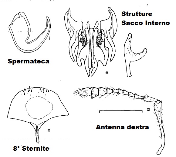e) Setole elitrali ed oculari corte. Quelle elitrali, sollevate solo un pò nella declività apicale.