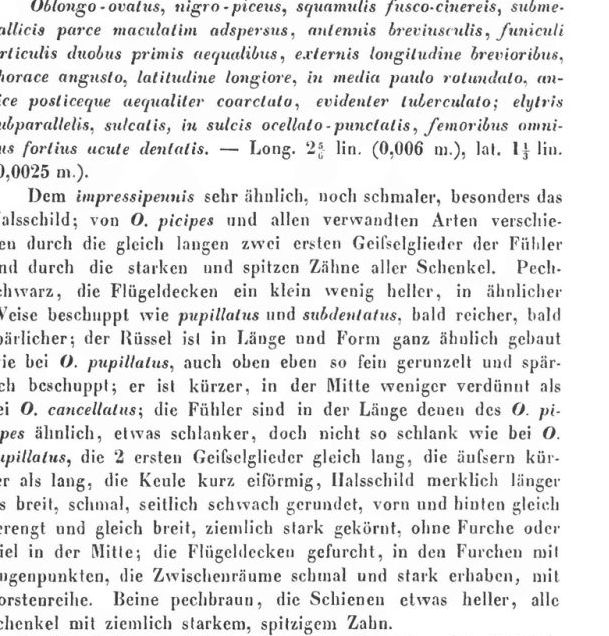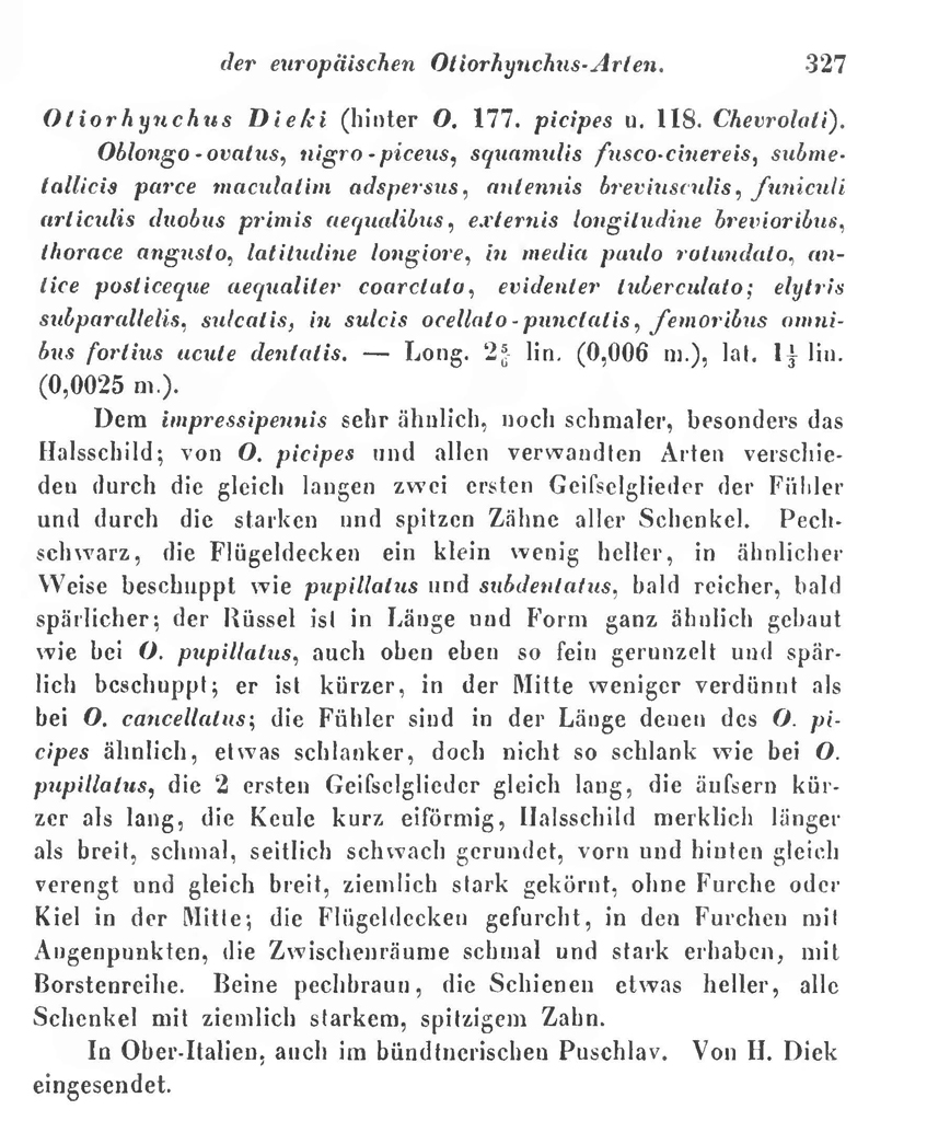 FORBIX ha scritto: Splendido sottogenere ma non certo alla mia portata.  Troppe specie e troppo poca letteratura a mia disposizione  . In realtà il diecki mi sembra sia segnalato di Umbria ma non delle Marche.Per le specie del subgenere Metopiorrhynchus, nelle Marche, almeno fino ad "Abbazzi e Maggini, 2009" dovrebbe essere segnalato solo il vernalis ...anche se in effetti non mi sembra questa specie. Per quanto riguarda il diecki, uno dei caratteri distintivi dovrebbe essere quello di avere tutti i femori dentati. Credo che serva a ben poco, ma riporto di seguito la descrizione originale "Stierlin, 1872" di Otiorhynchus diecki. La località è al confine tra le due regioni Per quanto riguarda i femori sono tutti quanti dentati....se può interessare. .......ma, caro Leonardo  , non hai risposto al mio quesito  . Secondo te, i due esemplari, appartengono alla stessa specie?