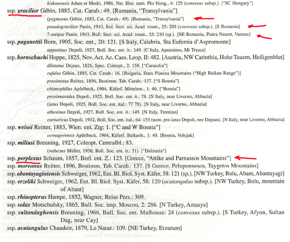 In conclusione sembrerebbe che in Grecia esistano tre sottospecie (a + b + c), l’esemplare di Marco dovrebbe essere proprio C. (Tomocarabus) convexus gracilior Géhin, 1885.