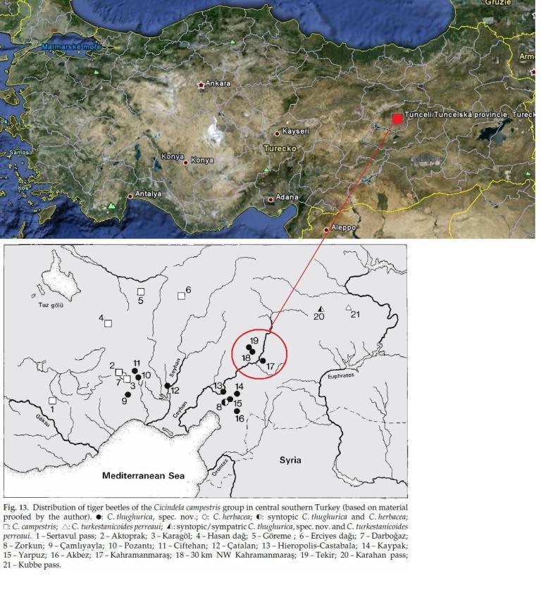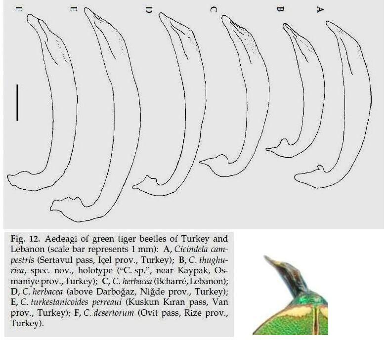 "A member of the Cicindela campestris group (= “groupe V” sensu Rivalier 1950), with a unique character combination among Middle Eastern species: small relative aedeagus length (≤ 3.8 mm, AL/EWm ≤ 0.86), small total length (≤ 11.8 mm in males, ≤ 13.2 mm in females), brownish-green dorsal exhibit a brownish green coloration and complete middle bands in most specimens. C. thughurica, spec. nov. differs from Near Eastern C. campestris by small aedegus length (≤ 3.9 mm vs. ≥ 4.1 mm), by less reduced elytral markings (middle bands complete in most C. thughurica, interrupted in most C. campestris), and by elytral coloration (brownish-green in C. thughurica, green in C. campestris). C. thughurica, spec. nov. differs from similar and geographic nearest (partly sympatric) taxa C. herbacea, C. desertorum, and C. turkestanicoides by its smaller relative aedeagus length (AL/EWm 0.72-0.86 vs. 0.87-1.10), by the more robust and less elongate shape of the aedeagus with a less pronounced apex, by its smaller total lengths, and a different elytral coloration (mostly brownish-green in C. thughurica, green in C. desertorum and C. turkestanicoides). In addition, C. thughurica, spec. nov. differs from C. talyschensis of northern Iran and Azerbaidshan in possessing a setose frons (glabrous in C. talyschensis) and in males by the rounded lateral sides of the elytra (elytral margins almost parallel in male C. talyschensis)."
