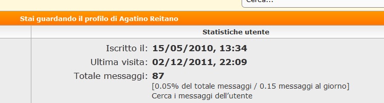 ALT ALT..................penso di aver capito pechè Agatino non inserisce le misuare a vostra grande richiesta e non ringrazia. Semplicemente perchè non si collega da 6 giorni!!!La cosa non mi sembrava molto sensata..........uno cattura gli insetti, li prepara, e poi non ha interesse a farseli determinare con certezza........2 erano le cose, o era un sadico  , oppure una volta inseriti i messaggi, non li leggeva più! Infatti la sua ultima visita è il 2 dicembre! Mi sa che ha una sfilza di messaggi in lista di attesa!!