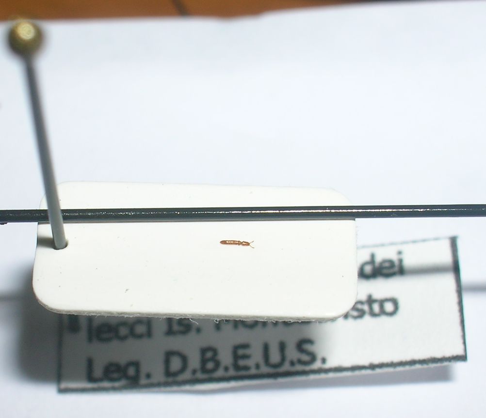Questa immagine rende meglio l'idea delle proporzioni della bestiola Sul cartellino, accanto al Leptotyphlus, c'è uno spillo entomologico n° 2