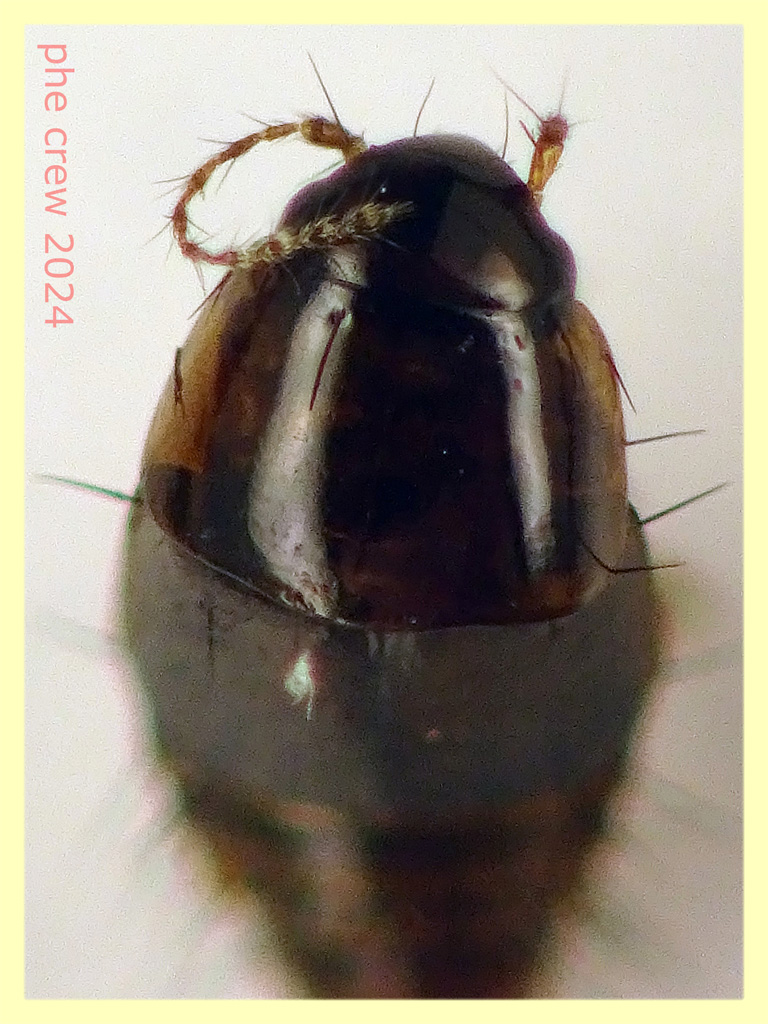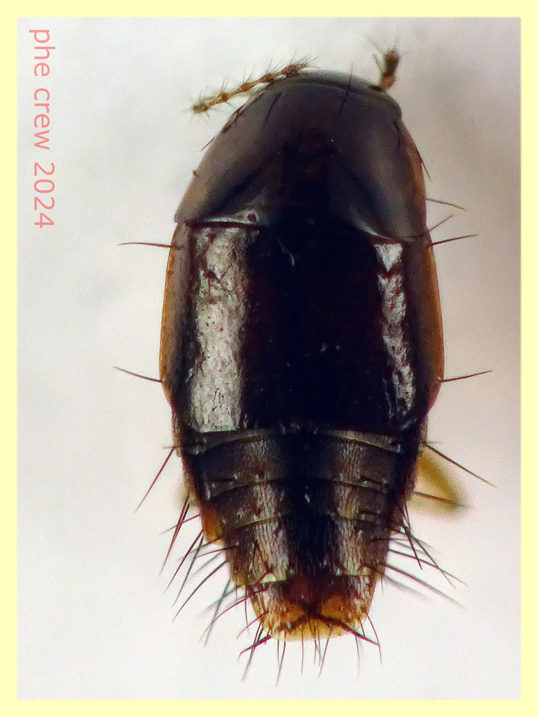 ...mi fermo a Tachyporinae, avrei detto Tachyporus sp., ma c'e' qualcosa che non mi convince...specialmente le antenne. Da vivo era piu' lungo, cosi' misura 2 mm. L' ho fotografato senza stenderlo per perdere meno setole possibili. Se mi indirizzate verso il genere cerco di fotografarlo meglio. |
