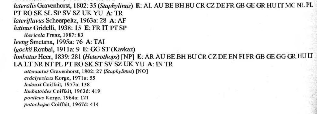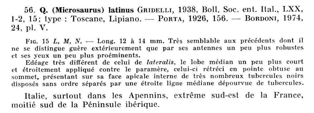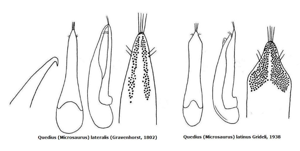 Quedius lateralis (Gravenhorst, 1802) Specie ampiamente diffusa in Europa, compresa l’Inghilterra, e in Asia Minore; manca nelle regioni più settentrionali. In Italia, nell’estremo sud-est della Francia e nel sud della Spagna è vicariato da Quedius latinus (Coiffait 1978). In territorio italiano si rinviene solo nel Carso, cui si riferiscono anche gli unici dati per le stazioni studiate, e nell’estrema Liguria occidentale (Pigna, dato inedito). Altre segnalazioni (ad es. von Peez & Kahlen 1977) vanno riferite a latinus. È un elemento silvicolo micetofilo (Horion 1965, Koch 1989). Quedius latinus Gridelli, 1938 Specie silvicola di lettiera. È diffuso in Italia in tutta la catena appenninica e in Sicilia, mentre sulle Alpi è limitato ai siti termofili del margine meridionale; è segnalato anche dell’estremo sud-est della Francia e della Spagna centro-meridionale (Coiffait 1978). Vicaria in Italia Quedius lateralis, che si rinviene solo nel Carso Triestino. Il massimo della sua penetrazione all’interno della catena alpina si ha lungo la Valle dell’Adige e le sue laterali, dove raggiunge a nord la bassa Val di Non (Castel Thun, dato inedito) e i dintorni di Bolzano (Monticolo/Montiggl, dato inedito). È stato censito in 34 dei 70 siti oggetto d’indagine (11 faggete, 19 querceti/ostrieti e 4 leccete). Il suo habitat ottimale è rappresentato dal segmento centrale del gradiente lecceta-faggeta microterma, cioè i querceti e le faggete termofile dell’Appennino Meridionale.
