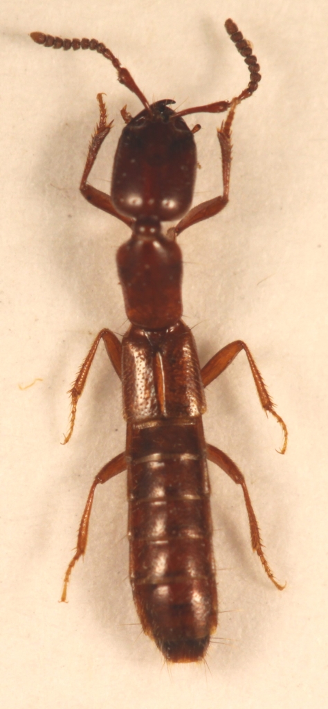Provo a fare il punto della situazione. Ho preso il volume della Fauna d'Italia e ho seguito le chiavi. Osservando l'esemplare al massimo ingrandimento ho constatato la presenza di occhi ridottissimi, formati solo da pochi ommatidi. Concordo con Giuseppe che siamo nel sottogenere Typhlodes. Concordo anche sul fatto che le due specie più probabili, stando al volume che è uscito nel 1982, sono holdausi e italica. Però, secondo me, nessuna delle due descrizioni corrisponde del tutto all'esemplare in questione. Se questo è vero, faccio due ipotesi: gabrielei, come suggerisce Anillus (ma non ho la relativa pubblicazione), o una specie ancora non conosciuta. Tutto ciò, visto che come detto non ho pratica di stafilinidi, senza aver estratto l'esemplare (del quale non conosco il sesso, perchè non sono sicuro che nel sottogenere Typhlodes i maschi abbiano i tarsi allargati). Sottolineo anch'io che non ho trovato, nel testo, alcun accenno alla mirmecofilia, che sembrerebbe essere un elemento di novità. Concludo ribadendo quanto detto nell'intervento precedente: se uno specialista del gruppo ritiene di studiare l'esemplare, me lo faccia sapere.