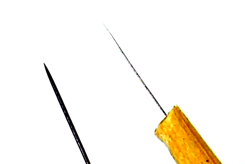 Questa è una delle micropunte di cui parlavo, montata su uno stecchino; per confronto, quello a fianco è uno spillo entomologico n° 000