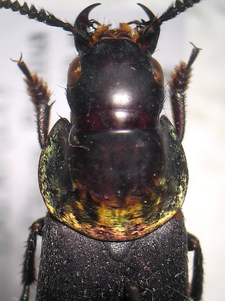 La maggior parte degli esemplari che ho ha sul pronoto un leggero riflesso variopinto, tale riflesso si vede appena nelle altre foto presenti sul forum, cosa in parte dovuta all'angolazione con cui si fotografa il soggetto.