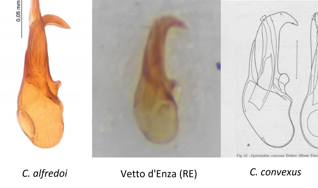 Tramite il confronto edeagico però non riesco ad ascriverli con decisione a nessuna delle due, questo edeago sembra quasi una via di mezzo, tendente più a C. alfredoi. C'è da dire anche che la forma sembra cambiare notevolmente a seconda dell'inclinazione del pezzo. Aggiungo un confronto con gli edeagi di C. alfredoi e di C. convexus. Non ho ancora preparato quelli raccolti a gennaio, non lontano da dove ho preso questi.